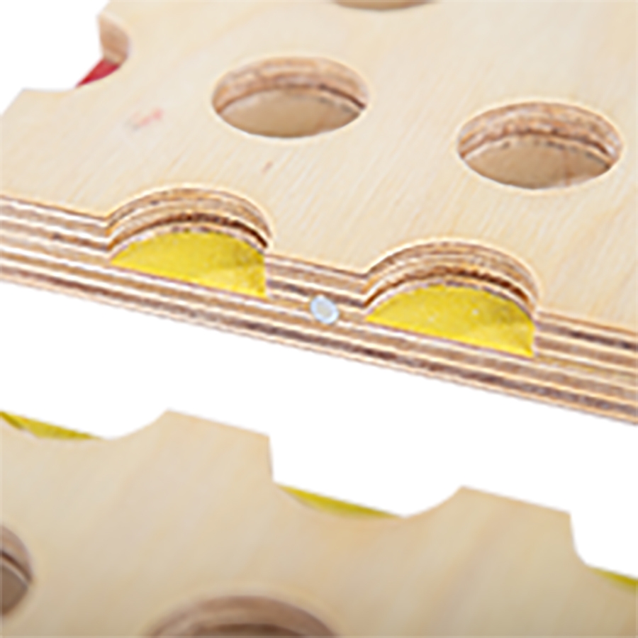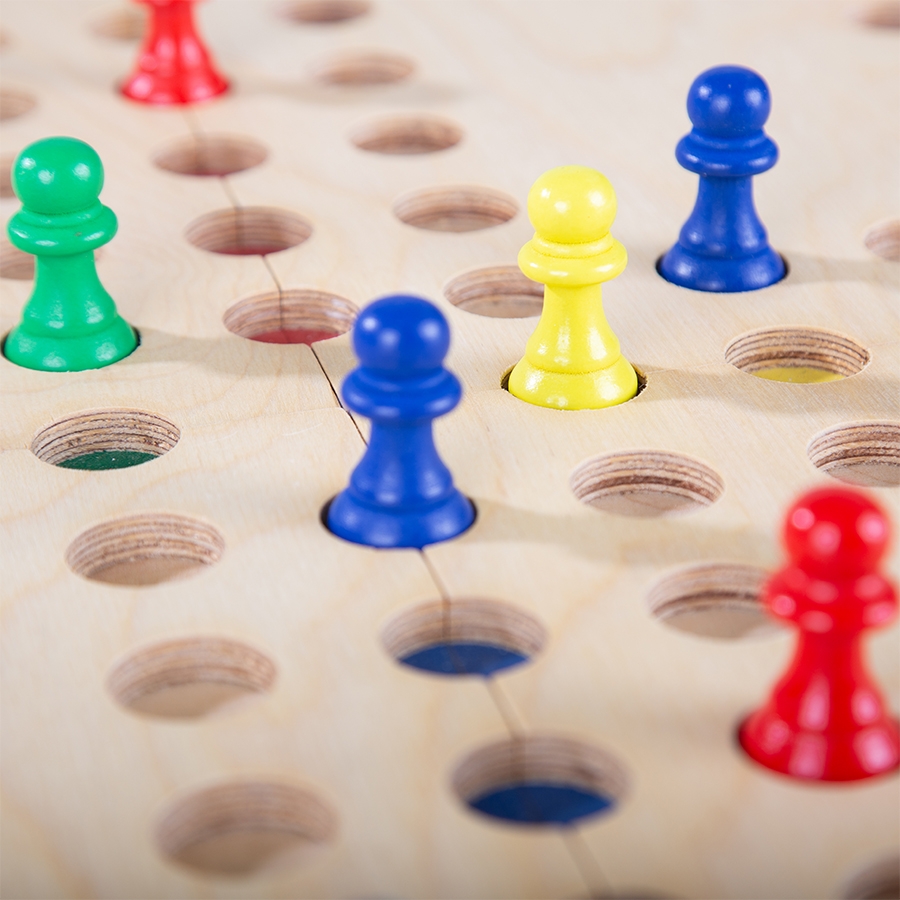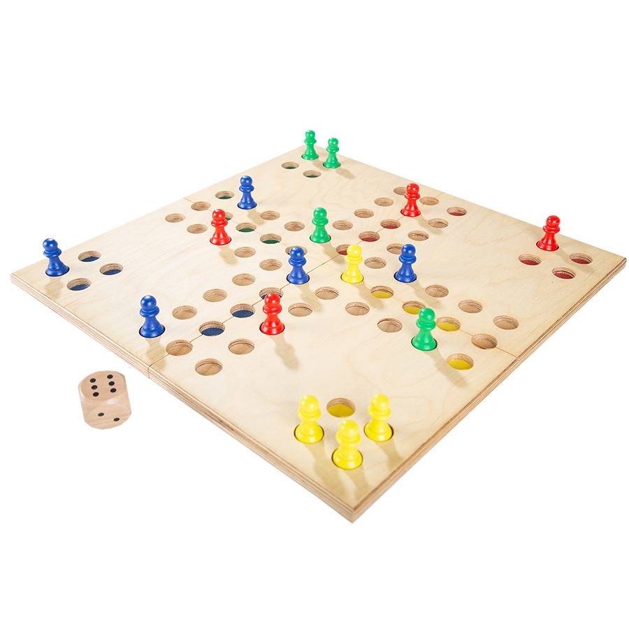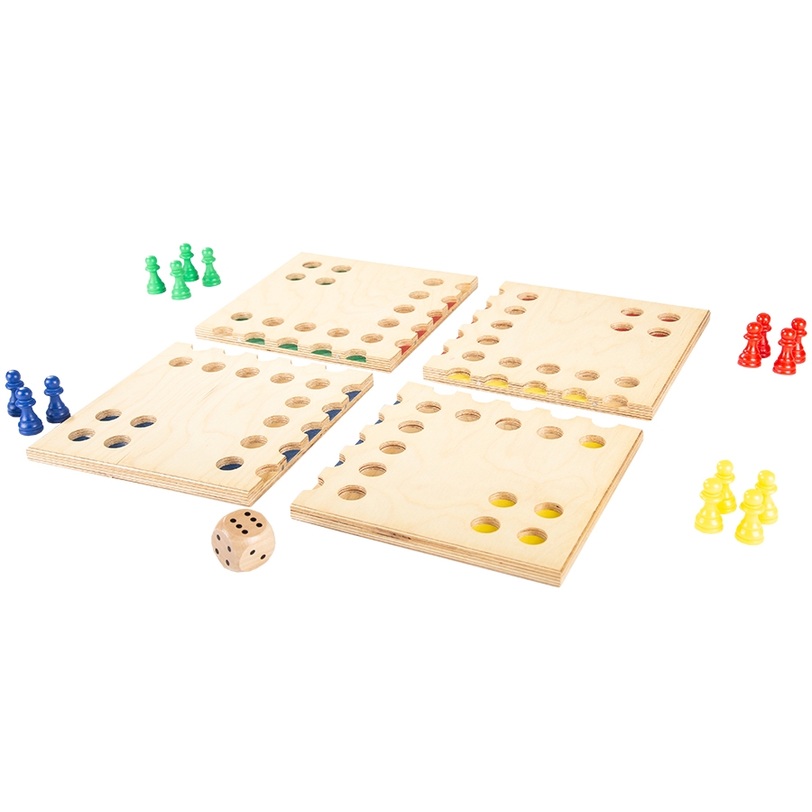 - Material: Spielbrett aus Birke Multiplex geölt, gebohrt, mit 4x4 Spielfiguren in rot,gelb,grün und blau
