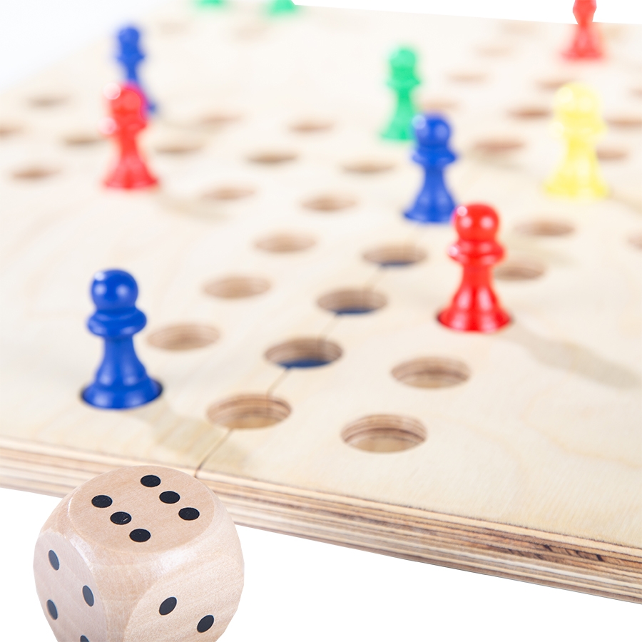 - Maße: Spielbrett 50cm x 50cm, 4-teilig zerlegbar, Spielfigur 5cm hoch, Würfel 2,5cm x 2,5cm, lackiert